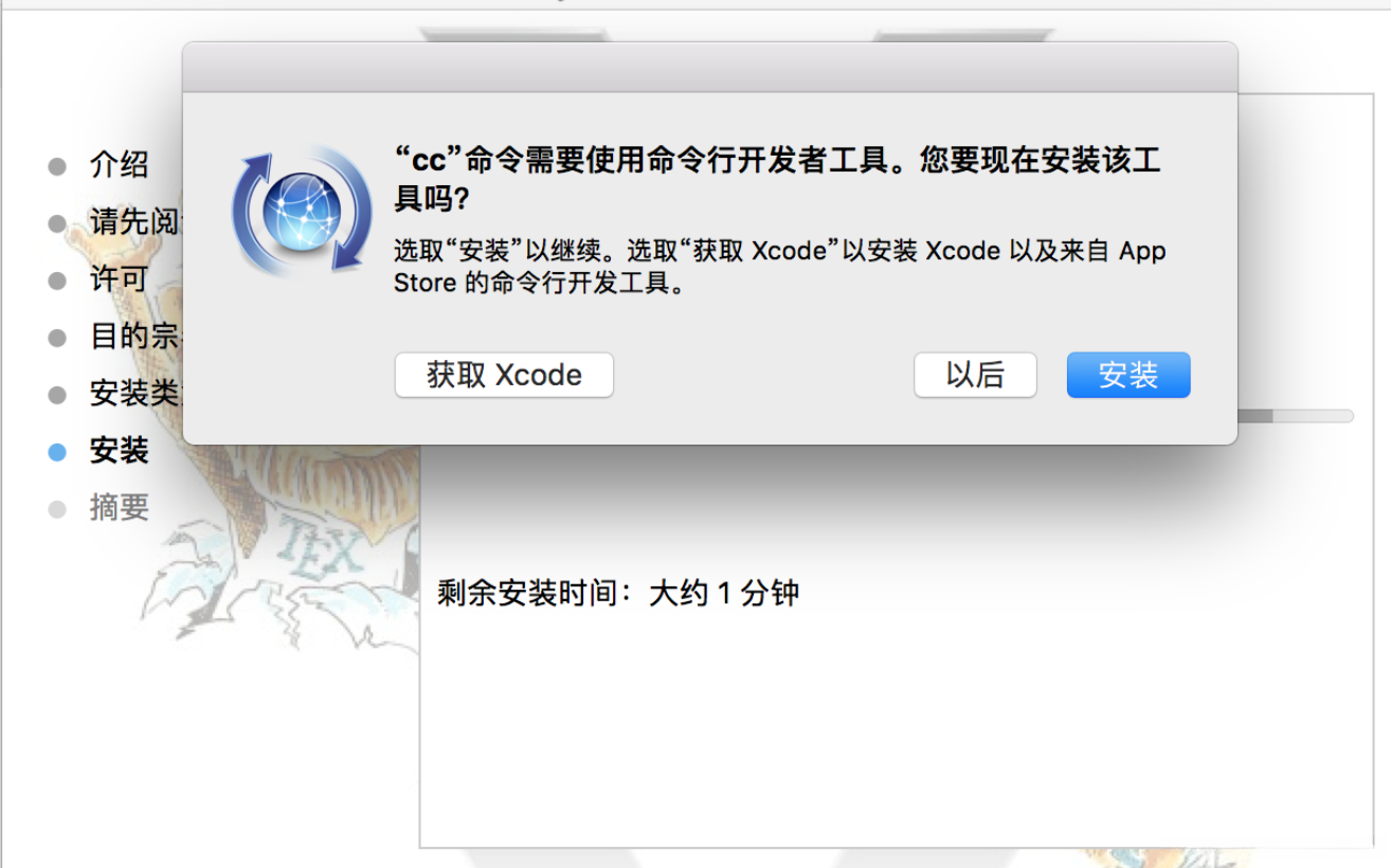 - 当安装接近完成时,可能会出现提示信息要求你先安装命令行开发者工具.按照提示操作后即可完成整个过程.