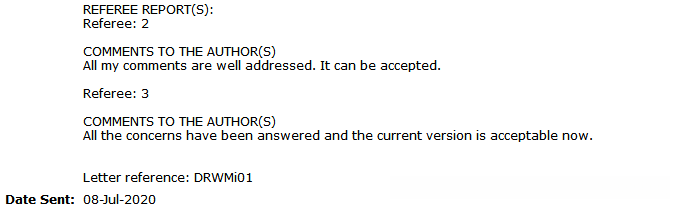 2020年7月8日这一天收到了审稿意见,并提出了小修改建议。此次小修改是由编辑指定的小修事项,在经过审稿专家讨论后一致同意接收。
