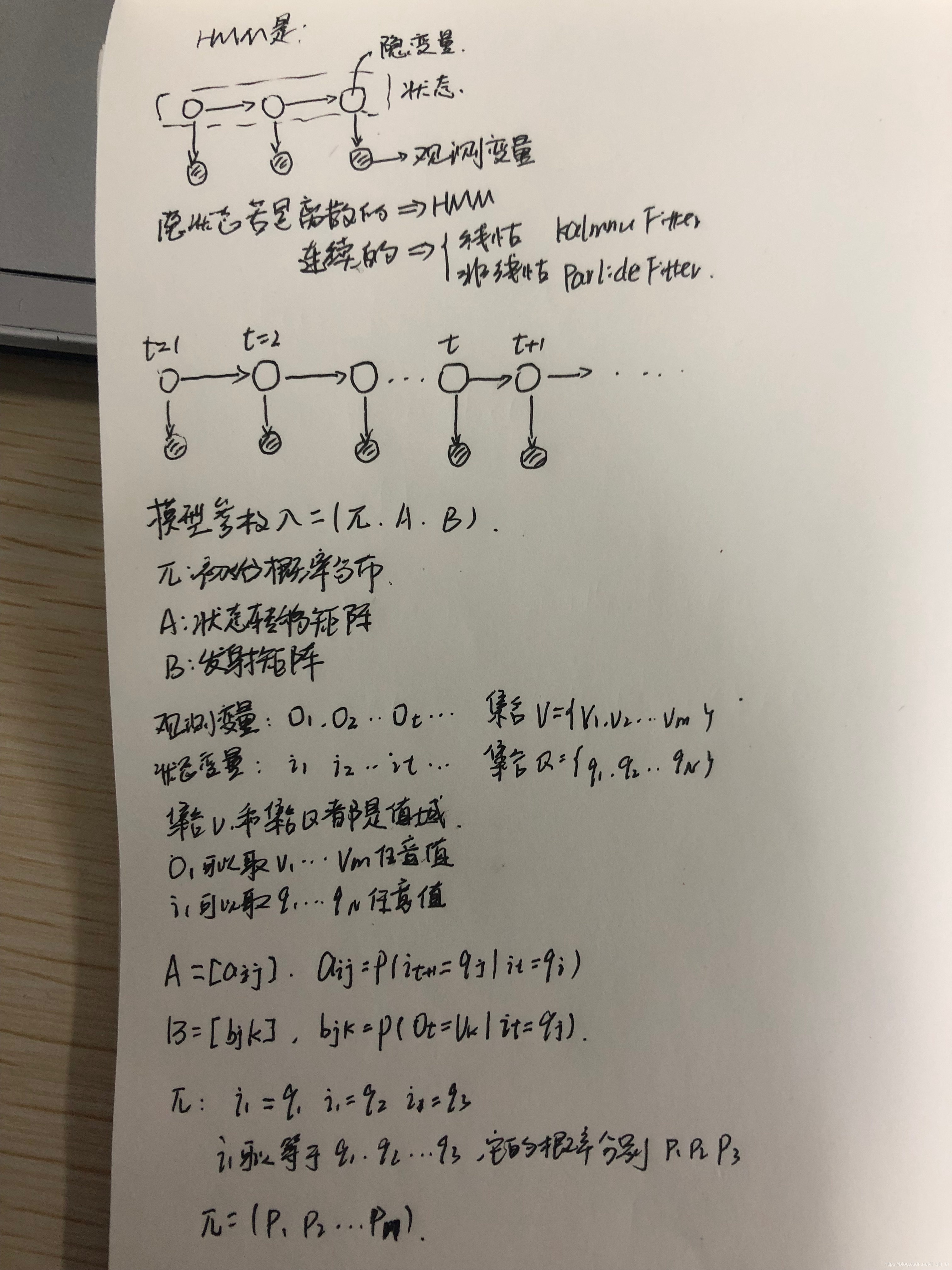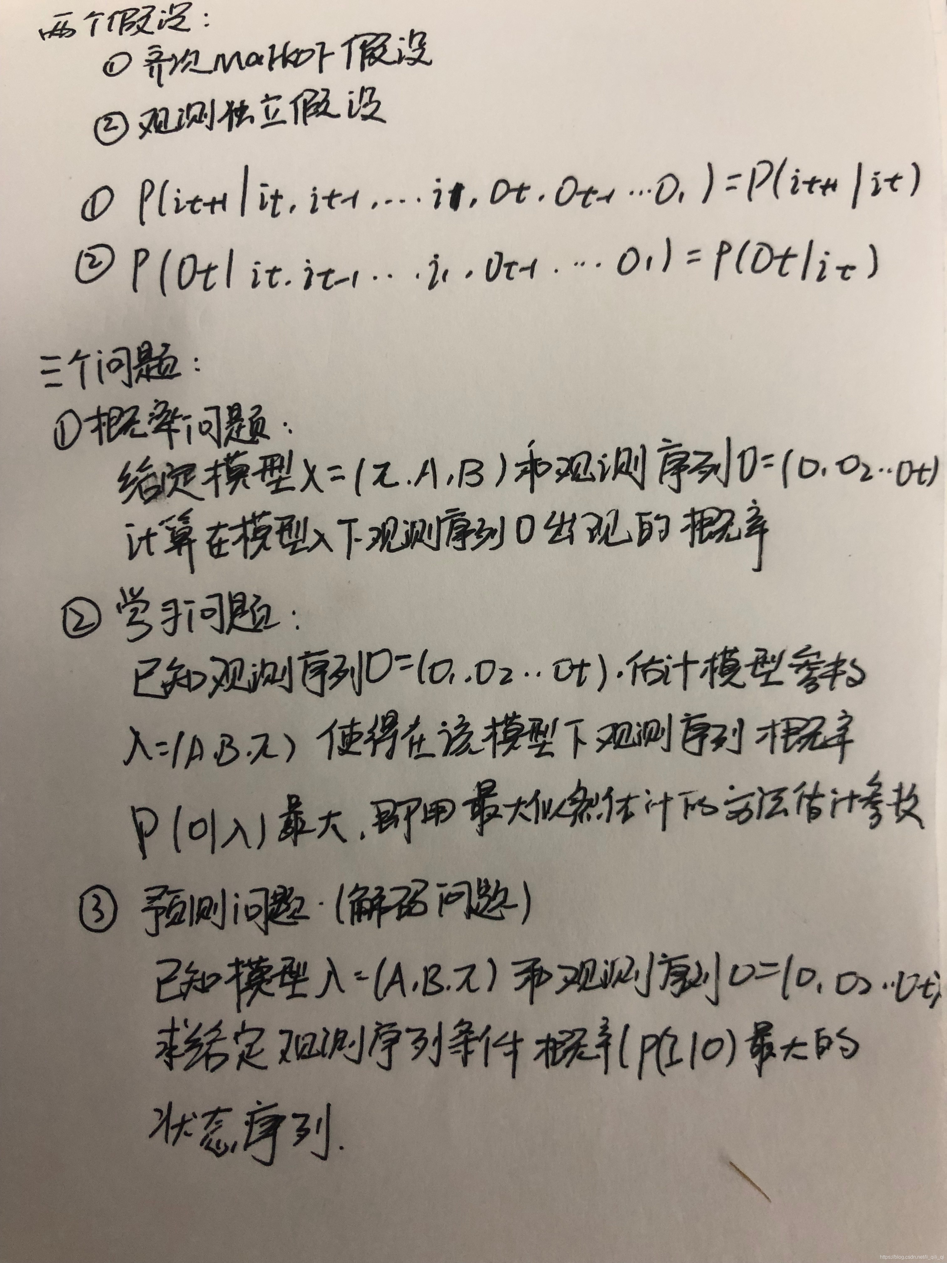 - 观测独立性假设:即假设任意时刻的观测只依赖于该时刻的马尔科夫链的状态,与其他观测即状态无关。