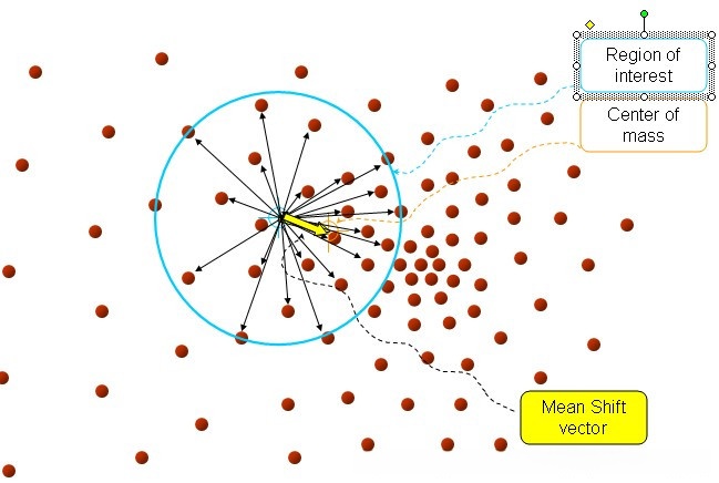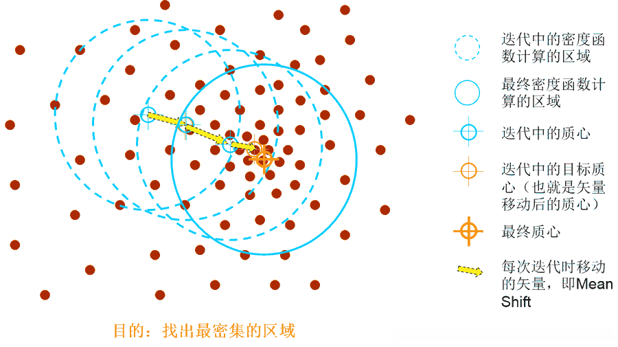 上图揭示了Mean Shift算法的基本工作原理,那么如何确定数据概率密度最大的区域?