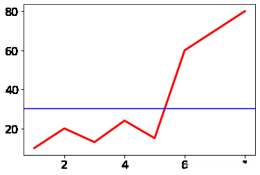 借助Python语言的matplotlib库进行数据可视化时,默认会生成折线图(line plot)。在绘制的图像中指定特定区域插入一条水平线条。