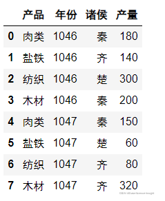df=pd.DataFrame(data, columns=['产品','年份','诸侯','产量'])