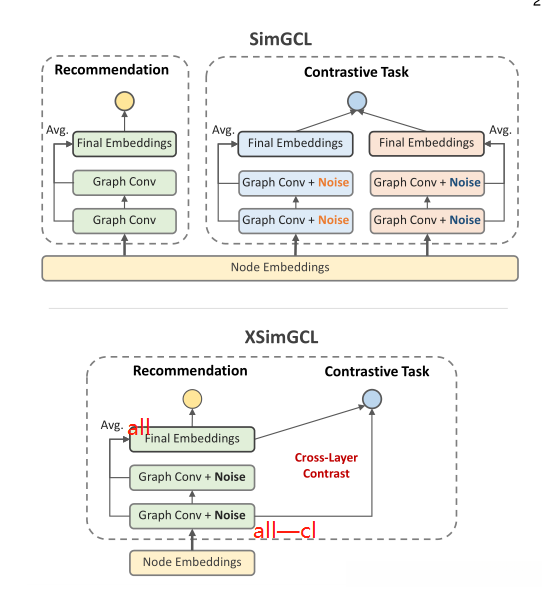 主要区别在于,在比较所学的两个最终表示类型时,SimGCL采用了不同的噪声处理,并结合普通表示方法进行推荐,而XSimGCL则在两个任务上采用了相同的扰动处理方式,并将跨层对比机制取代了SimGCL中的顶层对比方法