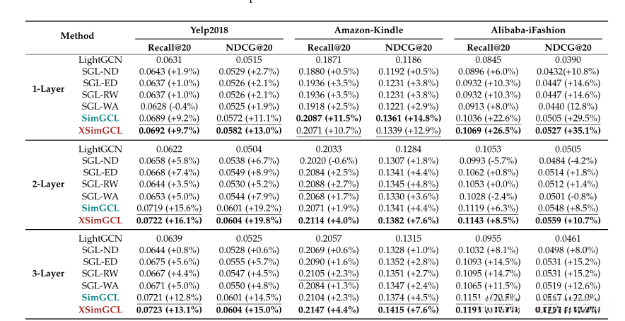 SimGCL由于其复杂的架构显得略显功能不足。在仅用于推荐任务的正向与反向传播之外,并需为小批量对比任务分别进行两次正向与反向传播的操作