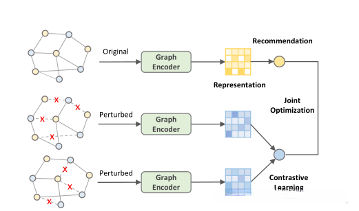 由于CL通过从未标记的数据提取通用特征的能力成为解决数据稀疏性问题的关键手段之一,从而推动了推荐技术的进步.该方法主要包含两个步骤:首先,通过应用结构破坏手段(如边/节点以特定比例被移除)来增强原始用户-项目二分图;接着,在联合学习框架下最大化来自各次图形增强所提取表示的一致性.