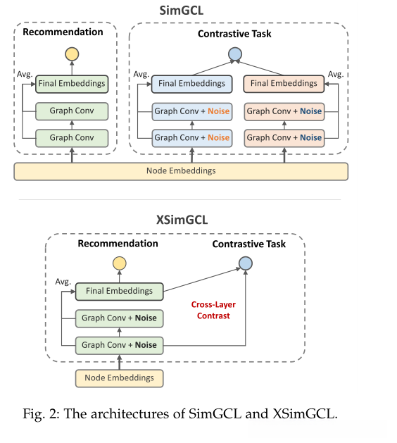 XSimGCL不仅沿用了SimGCL基于噪声的提升,并且通过优化传播机制显著减少了计算复杂度。如图2所示,在一个小批量处理中,XSimGCL共用了一个完整的正向与反向传播流程,而不是分别设置了独立的通道。具体而言,两个模型均采用相同的输入:初始嵌入与邻接矩阵