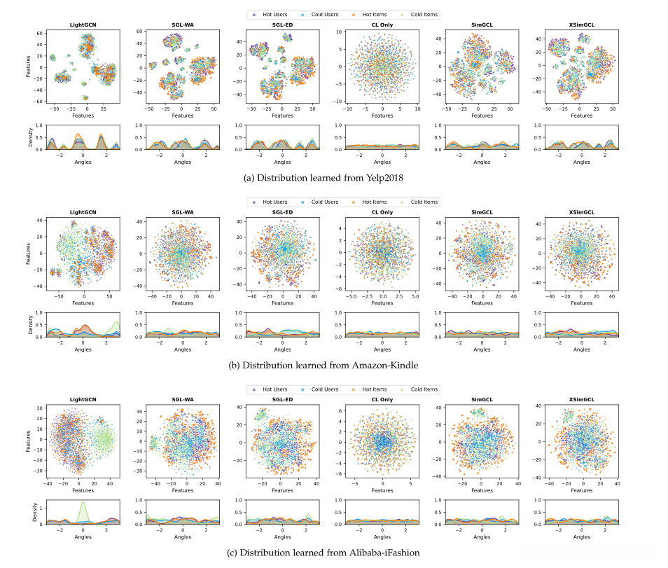 通过图中可以看出LightGCN与基于CL的推荐模型在特征/密度估计方面呈现出明显的对比关系。在左侧列中,LightGCN能够有效提取高度聚集化的特征,并展现出急剧上升和下降的密度曲线。值得注意的是,在热用户与热物品之间存在相似分布特征,在冷用户群体中则主要集中在热物品附近;仅有少数用户会出现在冷物品区域。从技术层面而言,这一现象表明该方法存在一定的偏向性方式,并可能导致模型持续向大多数用户提供热门项目以生成常规化的推荐结果