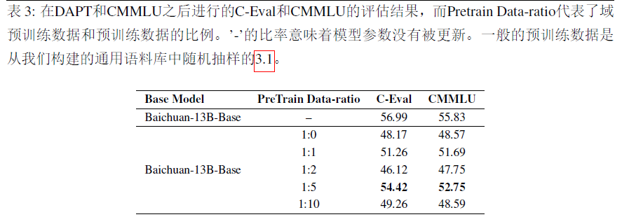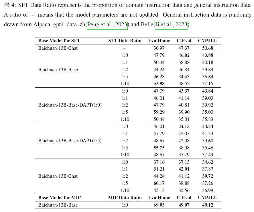 领域特定数据与通用数据之间的比率分别为:1:0(仅含领域特定数据)、1:1、1:2、1:5以及1:10。其中比率1:0意指仅使用领域特定的数据而未引入任何通用的数据。该模型基于预训练语言模型baichuan-13b-base构建,并命名为DAPT(Distributed Attention for Prompt Transfer),其参数配置为(\text{baichuan-} ¹³\text{b-base-DAPT})_{(¹⁵)}.