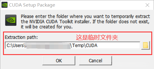 需要注意的一个问题: 安装的第一步是让你选择一个临时文件夹,并且这是一个临时文件夹,在完成安装后会自动被删除。你可以根据需要调整其存储路径位置;但请注意不要将这个默认设置误认为是CUDA官方的安装路径!如图所示