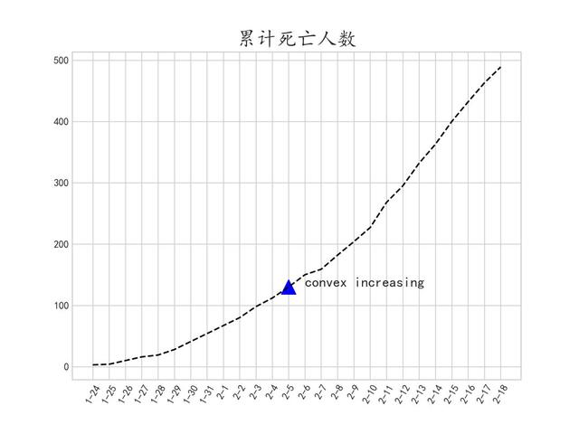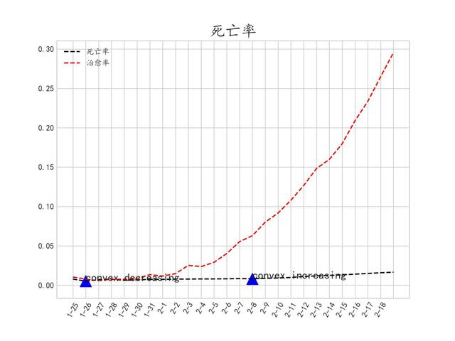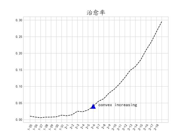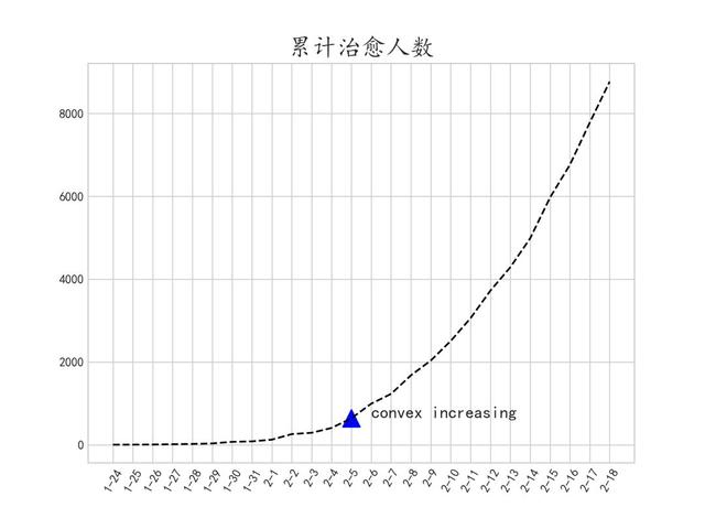 结合其convex+increasing的特点,可以说明从2月5日开始,累计治愈人数有了明显的加速上升趋势。