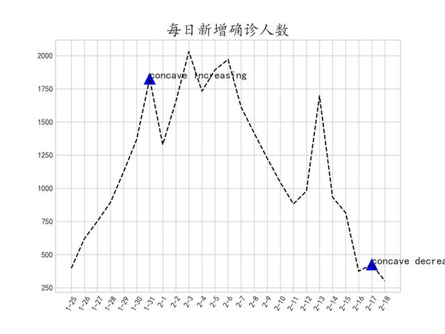 对于日新增确诊数 则找到了两个拐点,虽然这个指标在变化趋势上看波动较为明显,但结合其参数信息还是可以推断出其在第一个拐点处增速放缓,在第二个拐点出加速下降,说明全国除武汉之外的地区抗疫工作已经有了明显的成果:
