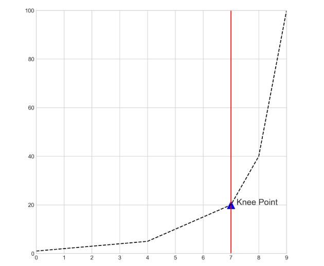 拐点检测(Knee point detection),指的是在具有上升或下降趋势的曲线中,在某一点之后整体趋势明显发生变化,这样的点就称为拐点(如图1所示,在蓝色标记出的点之后曲线陡然上升):