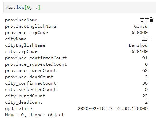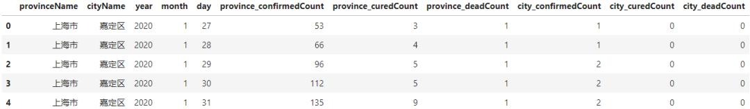 可以看到,原始数据中包含了省、市信息,以及对应省及市的最新累计确诊人数 、累计疑似人数 、累计治愈人数 和累计死亡人数 信息。