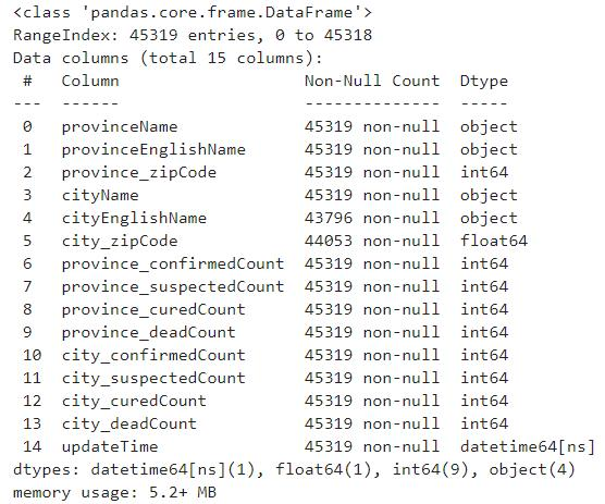 首先我们读入DXYArea.csv文件,并查看其信息,为了后面方便处理我们在读入时将updateTime列提前解析为时间格式: