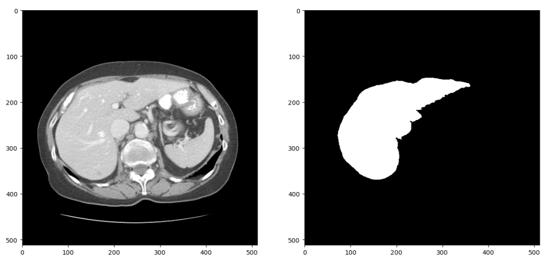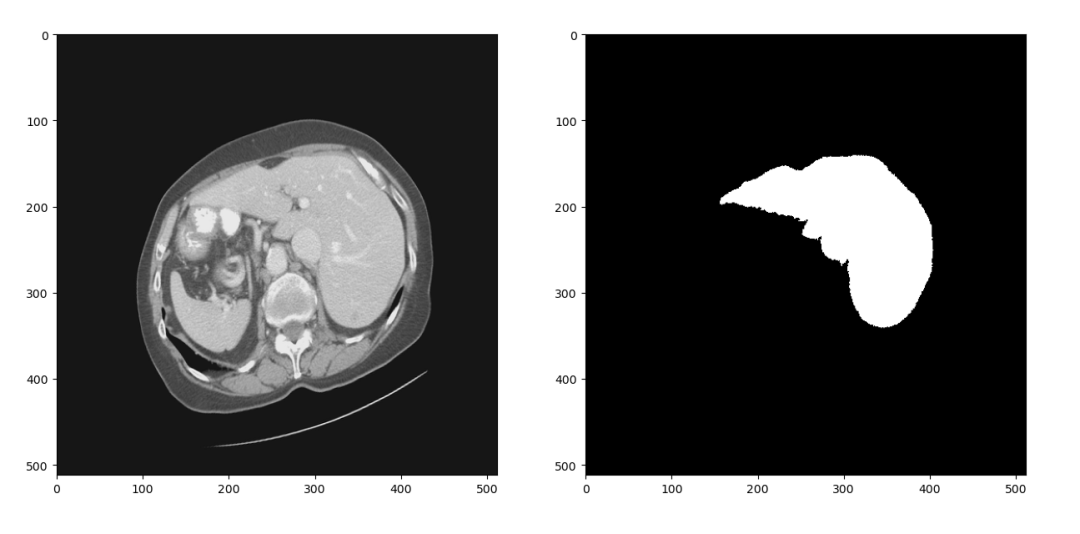 上述的Res-Unet结构是一个2D的分割网络,因此我们首先将LiTS数据集中3D的CT扫描分成2D的切片。CT在拍摄和重建的过程中会引入一些噪声,因此我们只保留-1024到1024范围内的数据。经过这两步处理,可以得到大概1万张CT扫描切片及对应的分割标签,随机选择一组进行可视化结果如下