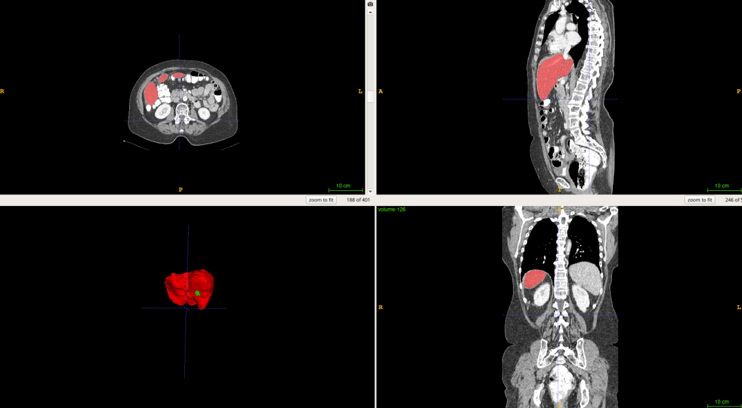 深度学习算法对一组CT扫描进行分割大概耗时15S,其效率明显高于医生阅片的效率。而且从分割结果中,我们可以计算获得肝脏体积,肿瘤数量,肿瘤体积,肝脏肿瘤负担等数量化的指标,更好地辅助医生进行诊断。
