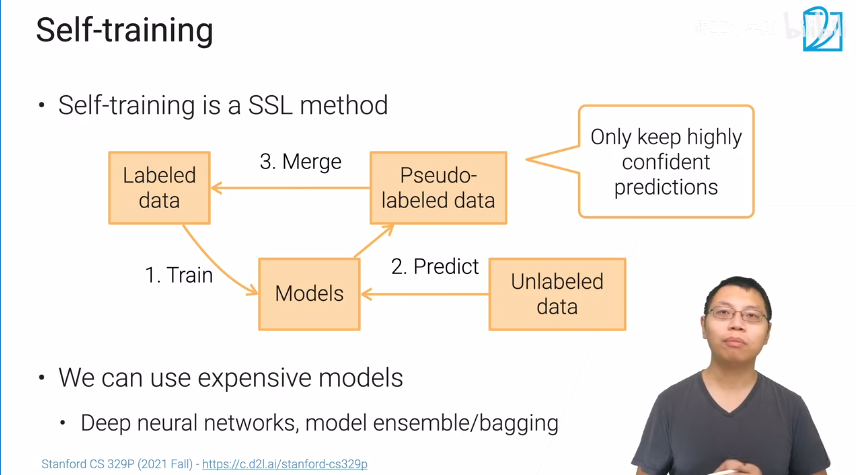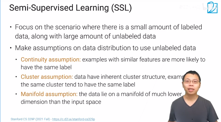 半监督学习啊其实当然是说你想有标志数据和没标志数据一起使用的话 ,对没有标志的数据和有标注数据的数据分布 做了一些假设: