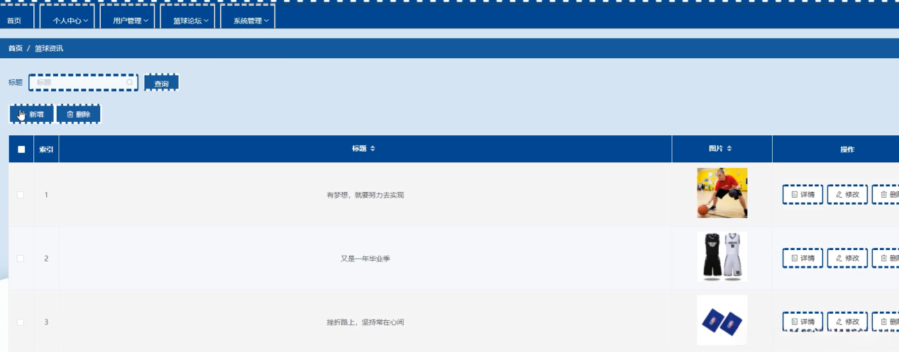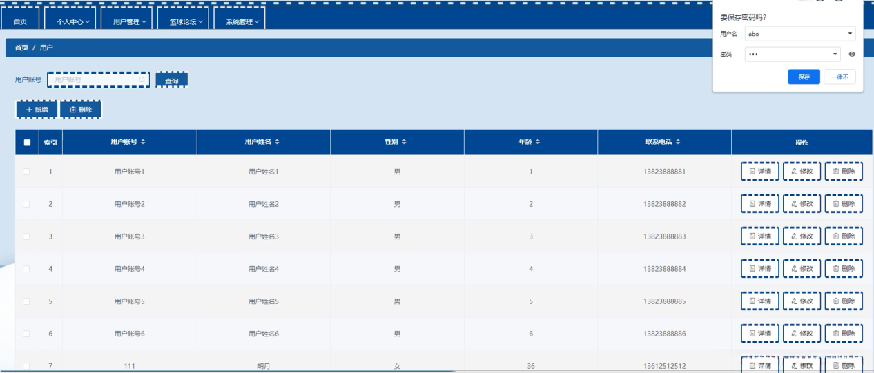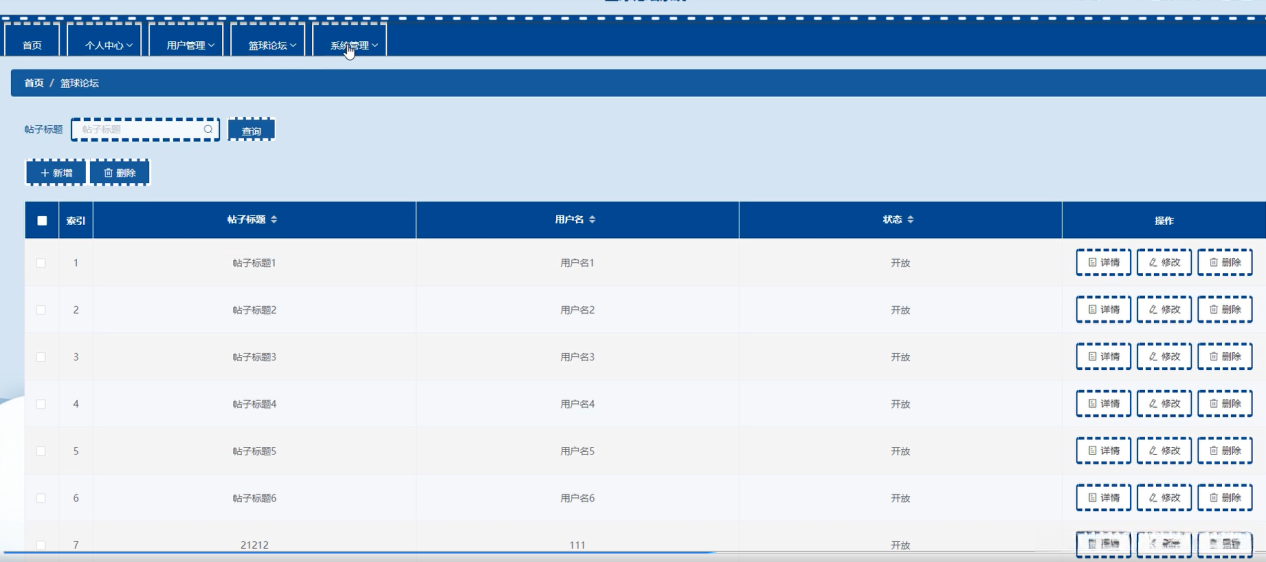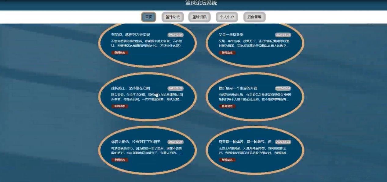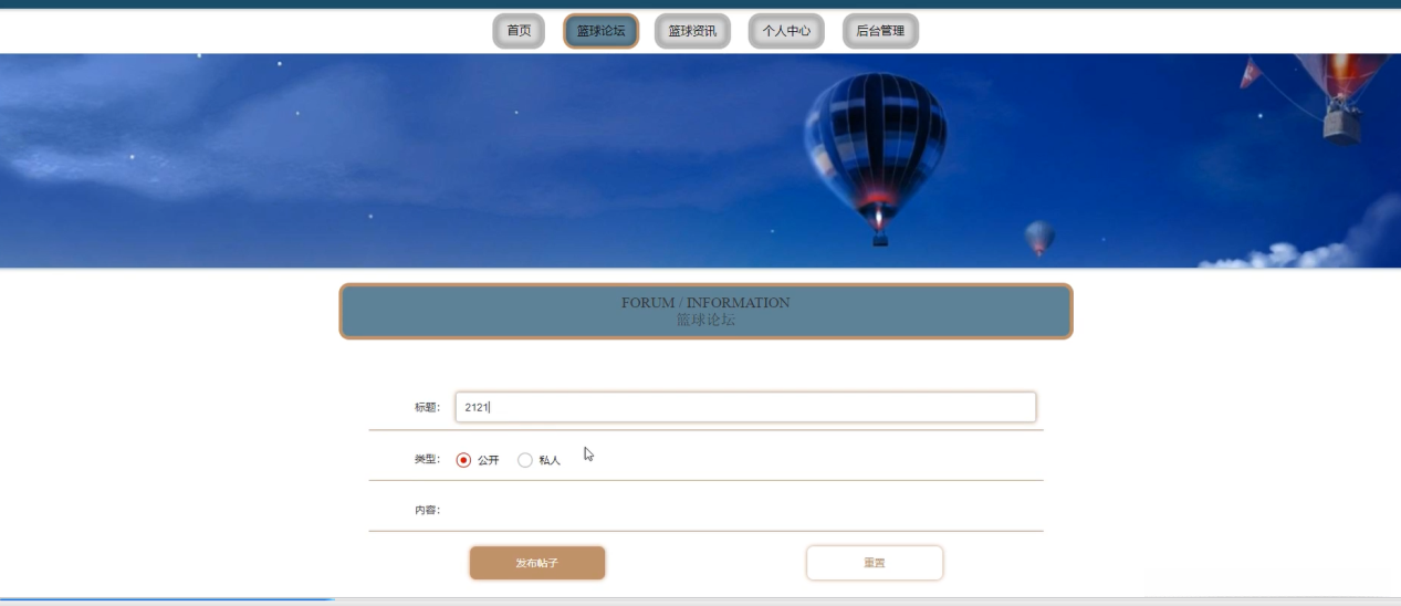 篮球论坛系统,在系统首页可以查看首页、篮球论坛、篮球资讯、个人中心、后台管理等内容,并进行详细操作。在用户注册页面通过填写,用户账号、用户姓名、密码、确认密码、年龄、联系电话等内容进行注册等操作等信息进行注册操作。在篮球论坛页面可以查看标题、类型、内容等内容进行发布帖子等操作。在个人中心页面通过填写用户账号、用户姓名、密码、性别、年龄、联系电话等内容进行更新信息等操作,并可以根据我的发布进行相应的操作。