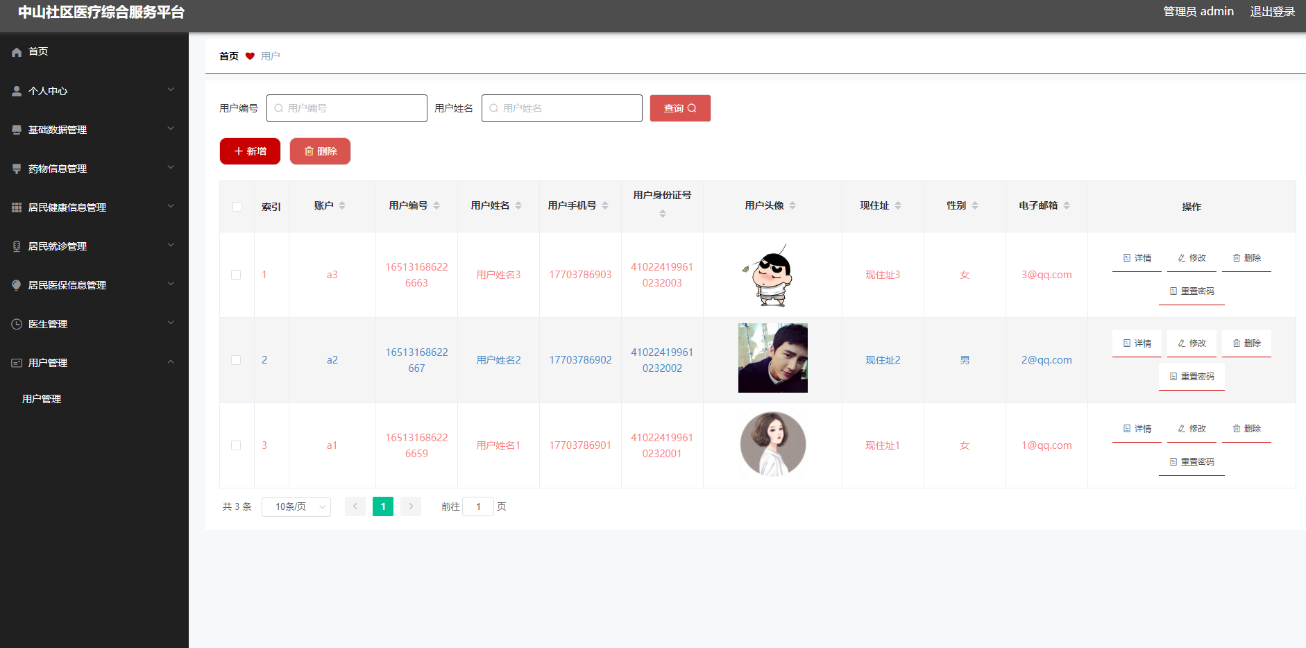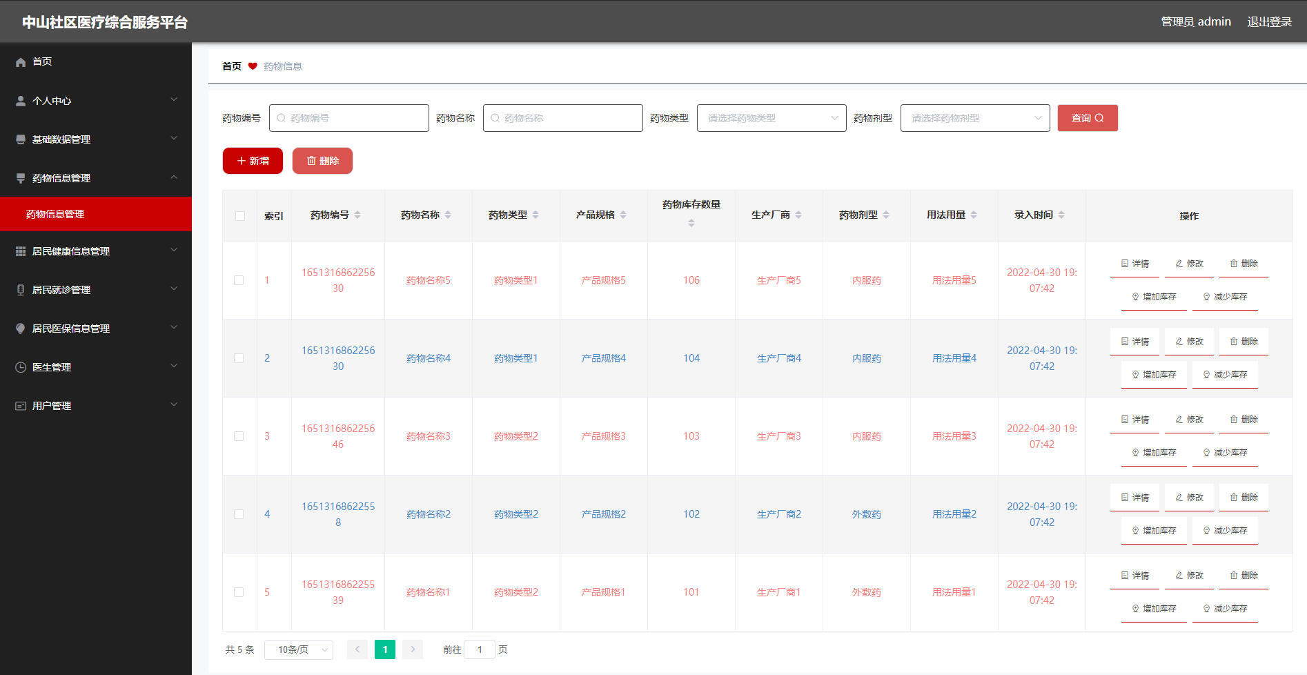 中山社区医疗综合服务平台管理员可以管理用户的基本信息,可以管理药物信息,可以管理药物信息等。