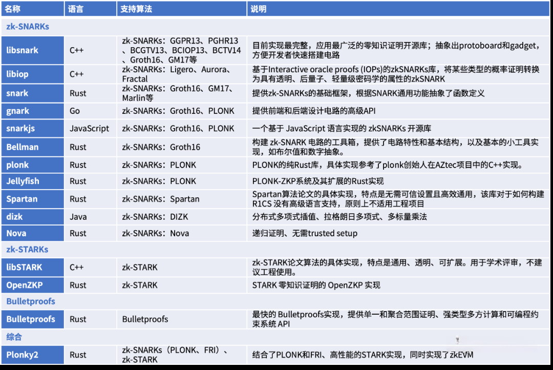 表格归纳出十几个与零知识证明相关的开源算法库集合。这些涵盖多个编程语言支持的zk-SNARKs、zk-STARKs、Bulletproofs开源库,并提供全面支持的Plonky2项目。这些列出的ZK系统中绝大多数都具备zk-SNARKs功能。其中大部分系统均基于特定领域的研究论文开发实现,并主要用于学术研究而非工程实践,在这种情况下不建议直接使用这些项目进行实际应用开发