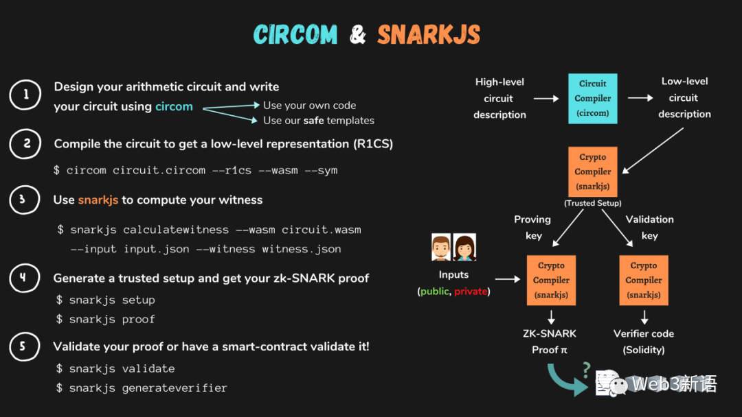 随后可在链下利用生成的证明代码创建ZK证明,在链上则使用智能合约来验证该ZK证明。