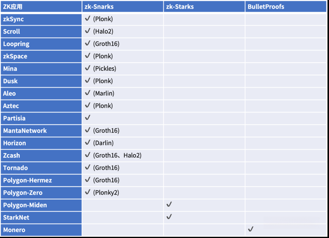 基于上文所述,在分析多个典型零知识项目的采用算法时发现:结果显示zk-Snarks作为当前最广泛应用的主要零知识证明方案之一;其中Groth16和PLONK被认为是基础且应用广泛的两种零知识证明方案;而在Zcash网络中主要由StarkWare团队开发实现;而Bulletproofs技术已在Monero中成功应用于区块链领域,并成为首个将该技术应用于区块链的主要数字货币之一。