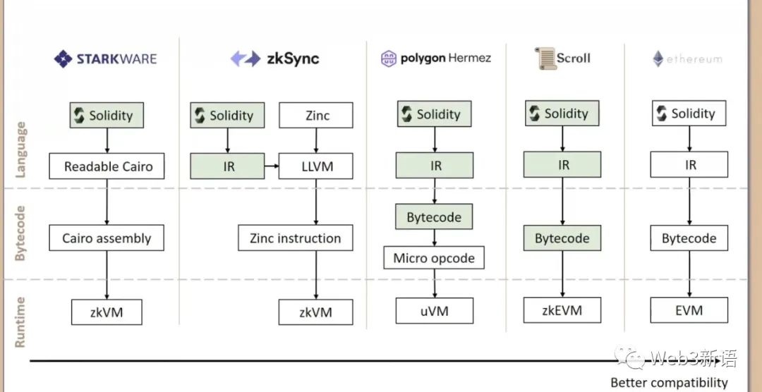 与zkSync及Starkware相比,在构建智能合约时都需要依赖专门的编译工具来转换代码为兼容零知识证明指令集(ZK-IR),然而这种设计并非基于以太坊原生虚拟机(EVM)构建,并非EVM内核直接支持的语言兼容性;而Scroll正在开发一个零知识证明以太坊虚拟机(EVM),这意味着Scroll生态系统中的开发者能够直接使用与以太坊虚拟机功能相仿的环境,在零知识证明层面上实现对Layer 1上运行的应用程序进行扩展部署