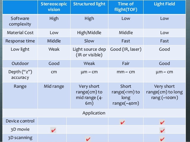 | Intel(Omek) | 33ms | 30Hz | 90度 | 1-3 | 1m外 | 1099 | 结构光 | |