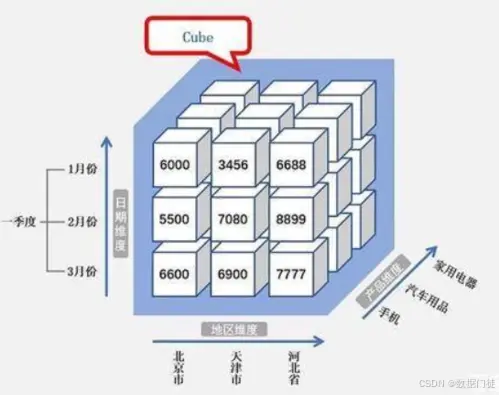 从结构上来看,数据立方体系统实际上是由一个个独立的立方体单元所组成;每个立方体单元对应着特定的数据汇总结果;这些结果都是基于原始数据,在其对应的维度下经过必要的聚合运算而生成的;而构成这个复杂系统的基础要素则包括两类核心要素:一类是用于描述现象或事物特征的维度要素(如商品种类、地区分布、顾客特征等),另一类则是用于衡量或计算的具体指标要素(如计数函数count()、总计函数total_sales()等)。
