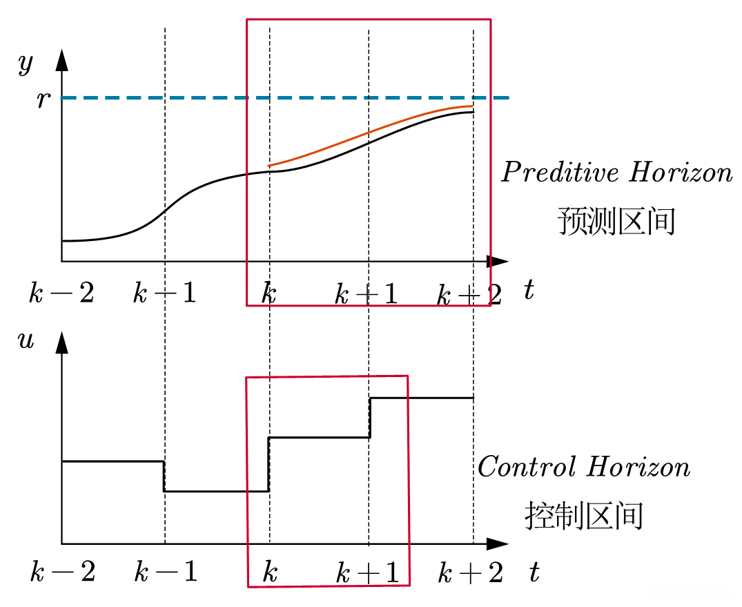 这是MPC模型中一个非常重要的特点称为滚动预测,在这种机制下系统会不断根据当前状态调整未来的行为以达到预期目标。其原因在于工业生产过程中不可避免地存在各种外部干扰因素以及设备本身的局限性导致实际输出无法完全吻合理论预测值。例如图所示在时间K点系统基于历史数据做出的输出预测值为黑色线条但实际运行中由于各种不可控因素的影响实际输出轨迹呈现出红色走向两者之间存在显著偏差即使是在时间K点初始偏差较小但由于过程累积效应随着时间推移这种偏差将对系统的稳定性造成严重威胁。因此滚动预测本质上是一种实时迭代的过程需要消耗较大的计算能力和时间资源这也就限制了MPC模型在处理快速响应型工业过程时的应用效果尤其是在追求低成本和高效率的工业化生产环境中这一挑战显得尤为突出