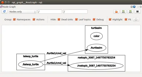 启动一个新的Terminal窗口后,请执行以下命令以观察到node之间的topic通信关系: