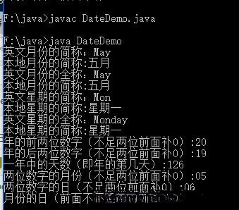 | b | 月份的简称 | String str=String.format(Locale.US,"英文月份简称:%tb",date)//May System.out.printf("本地月份简称:%tb%n",date);//五月 |