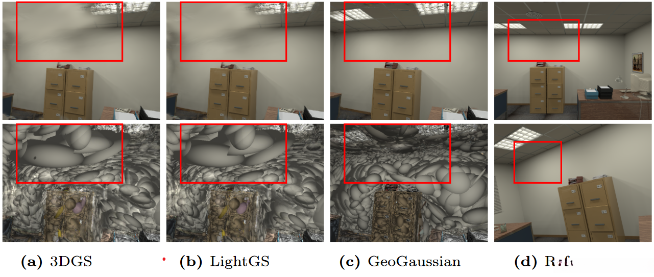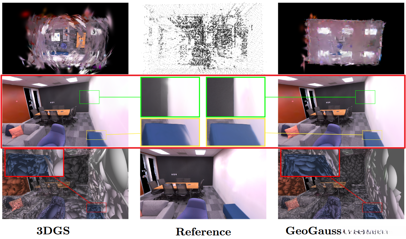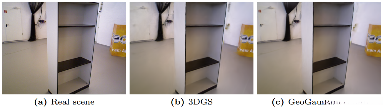 GeoGaussian is capable of clearly delineating an exceptionally sharp contrast between two low-textured surfaces. However, 3DGS exhibits poor resolution characteristics due to inaccuracies inherent in its underlying 3D Gaussian model, which manifests as observed blurring effects in this particular area.