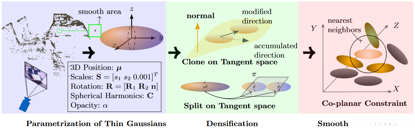 Our method first imparts a more precise geometric interpretation to Gaussian parameters. The third scalar in the scale vector serves to regulate thickness, while the third axis in rotation matrices identifies and defines the primary orientation axis for thin ellipsoids, with its primary orientation derived from initial point cloud data.