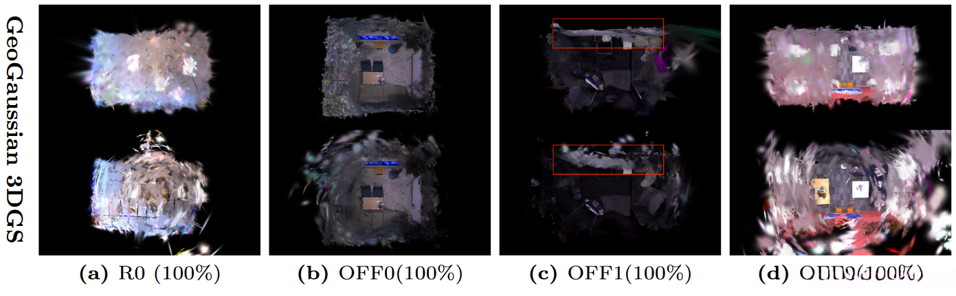 During the 3DGS optimization process, the scene's geometry is prone to gradual degrading if its structural integrity isn't meticulously maintained. Particularly concerning non-textured areas such as walls, ceilings, and furniture surfaces. This degradation has a significant impact on rendering quality when novel views diverge substantially from those in training datasets.