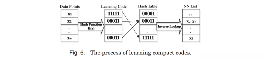 如图6所示:左侧为数据点。利用哈希函数H(x)进行处理即可获取每个数据点对应的压缩编码。进而通过哈希表的逆向搜索来确定NNlist