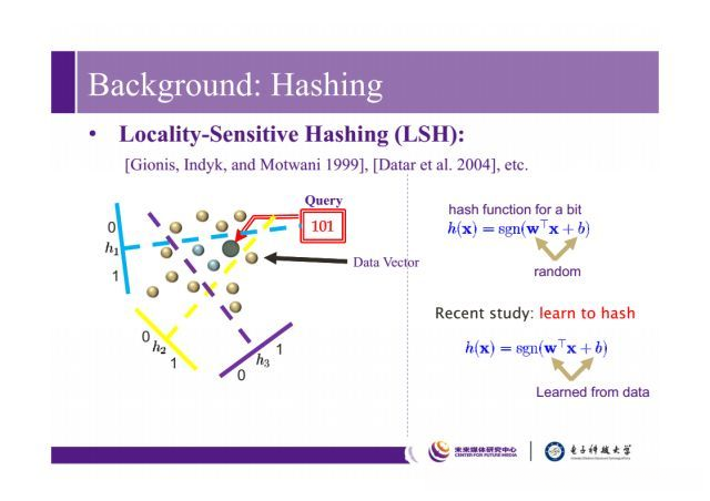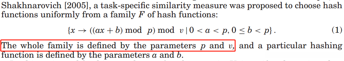 该哈希编码方案具备降维功能,并能将原始高维数据映射至低维空间。最初由Donald于1999年提出了一种基于概率的方法,在这种方法中每个映射所需bits的数量为d乘以log k(其中d为原始维度、k为降维后的维度)。然而这种方法存在不足之处导致无法高效地存储所有可能的选择。随后开始采用固定模式的设计。随后Carter and Wegman在1977年提出了通用方案——即从特定集合中选择时延展性好的哈希族。例如Shakhnarovich于2005年对此有所改进。值得注意的是这种设计使得时间复杂度得以维持在常数级别。”