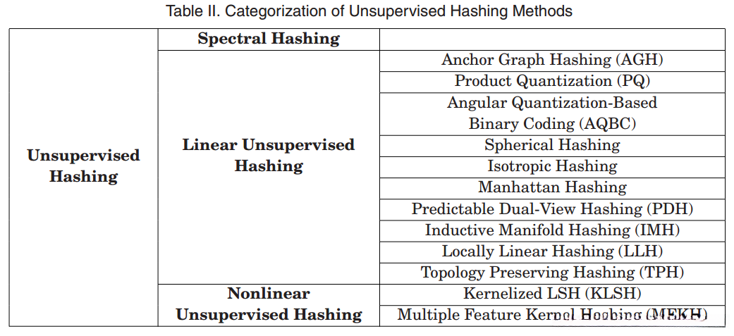 根据实际的哈希函数组成:包括特征函数、线性和非线性函数等元素,在无监督条件下将这些算法划分为以下三类:谱哈希、线性哈希以及非线性哈希