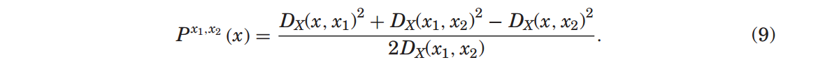 代表原始空间中一维欧几里得嵌入P₀的形式。o被称为引用对象。如果Dₓ违反三角不等式(即三角形任意两边之和大于第三边),那么在原始空间中原本接近的点就会通过P₀映射到实数线上呈现为相邻点;另一方面,在原始空间中相距较远的点也可能被映射至相近的位置。