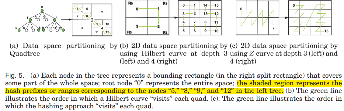 本文列举了几种树形结构用于分割数据空间,并通过实验验证这些结构在性能上均优于传统的顺序扫描方法。例如,在二维空间中使用四叉树能够高效地将区域划分为四个互不重叠的部分。Joly et al. [2004] 和 Poullot et al. [2007] 研究了基于内容的拷贝识别问题,并提出了一种创新的方法:伪-不变特征识别策略(Strategy of Pseudo-Invariant Feature Recognition)。该方法采用了Hilbert曲线作为投影线,在映射过程中直接计算并存储一个Hilbert曲线上近似的覆盖范围以提高搜索效率。其优势在于确保索引中相邻的数据点在描述的空间中仍为相邻。