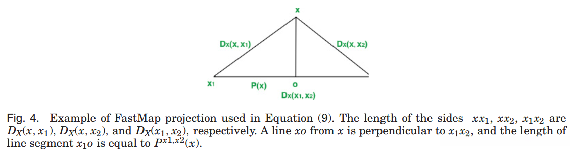 FastMap的核心概念在于通过两个选定的数据点(pivot objects)来构建映射关系。随后计算任意给定对象x的嵌入表示P_{\text{x}_1,\text{x}_2}, 并将其视为位于连接\text{x}_1到\text{x}_2线段上特定位置的一个向量值指标。快速映射算法则分别基于与目标点之间的距离进行预测:首先根据x与\text{x}_1的距离进行初步估计, 然后根据x与\text{x}_2的距离进一步优化结果。这里所指的距离可以作为三角形的边来处理, 将其视为构成三角形边长的基础元素。