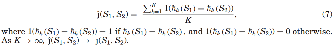 我们有两个置换函数 h₁ 和 h₂。令 S₁ = {¹,…} 和 S₂ = {³,…}。将 h₁ 应用于 S₁ 得到映射结果为 ² 因此有 h₁(S₁) = ²;同样地 对于 S₂ 我们得到 h₁(S₂) = ₇;而当应用第二个置换函数时 结果显示 h₂ 在两个集合上的映射均为 ₇;将这些值代入 Jaccard 相似度公式 计算得分子为 ¹ 而分母 K 等于 ² 最终得出 Jaccard 相似度为 ½