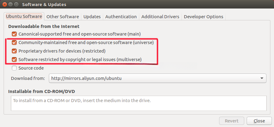 在 Ubuntu 中配置资源库时,默认选择‘restricted’、‘universe’以及‘multiverse’这三个选项。通常情况下无需进行设置,请参考如图所示的红色框区域中指定位置查看详细设置步骤。建议访问官方文档以获取详细信息