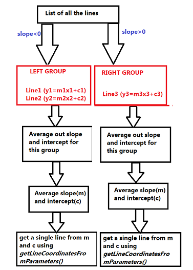 分组后,我们找到该组的平均斜率(m)和截距(c),并通过调用getLineCoordinatesFromParameters() 并传递平均值m和平均值c来为每个组创建一条线。
