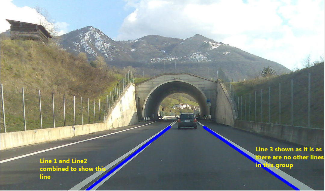 一旦我们从步骤3中获得了直线,在这一步中我们将这些直线分成两组(左边和右边)。如果你注意到步骤3的输出图像,那么该步骤将把Line1和line2放到左边的组中,而Line3放到右边的组中。