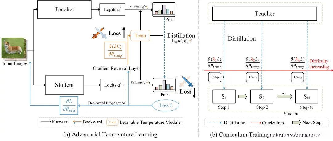 本文构建了一种基于动态温度超参的蒸馏新框架CTKD,该框架在学生模型的学习过程中,可学习的温度超参被训练以对抗的方式最大化蒸馏损失。通过可学习温度超参,CTKD将蒸馏任务组织成了一个由浅入深的序列,实现了显著的提升效果。同时,该方法可作为易于集成的插件,应用于现有的SOTA方法,带来显著的提升效果。