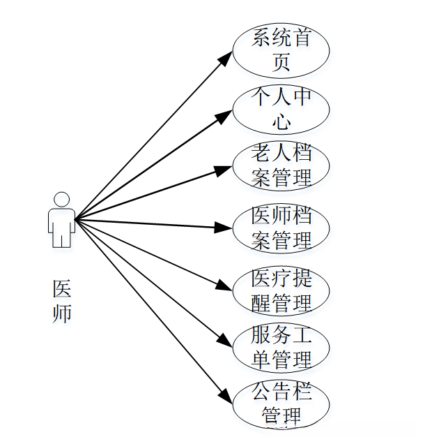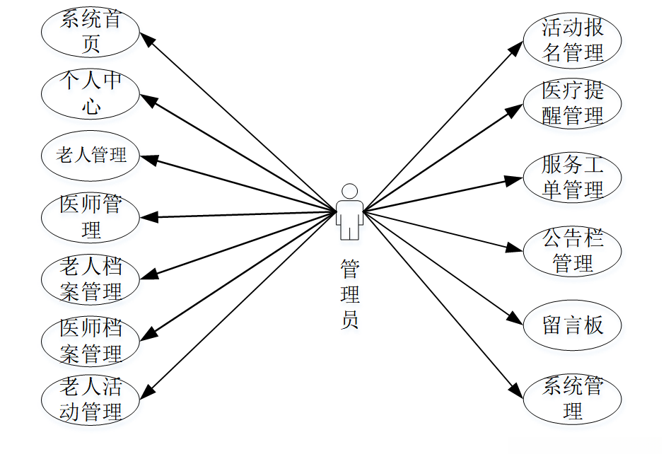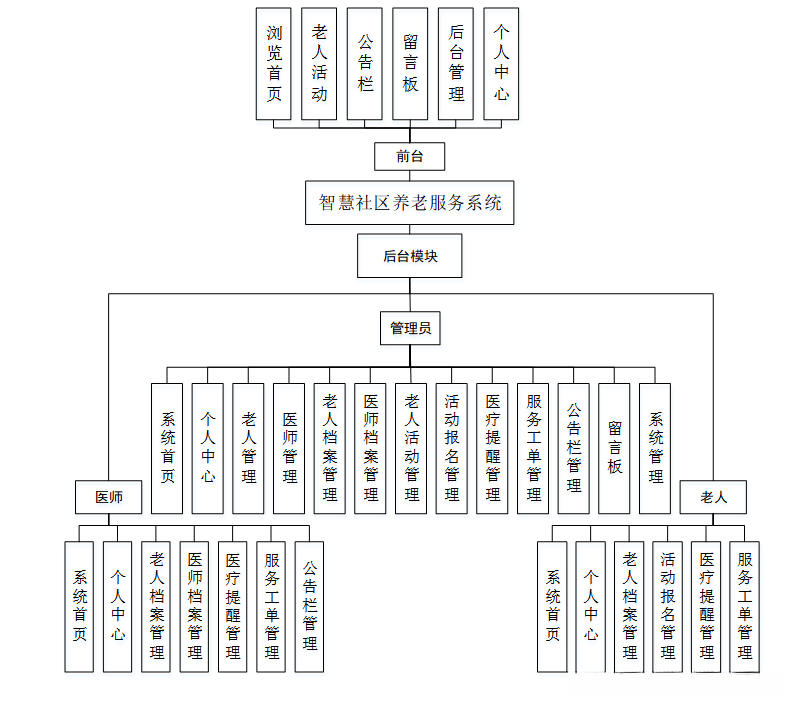 本系统采用自上往下的方法开发与实现,本课题要求实现一套智慧社区养老服务系统,系统主要包括管理员模块和医师、老人模块的功能模块;