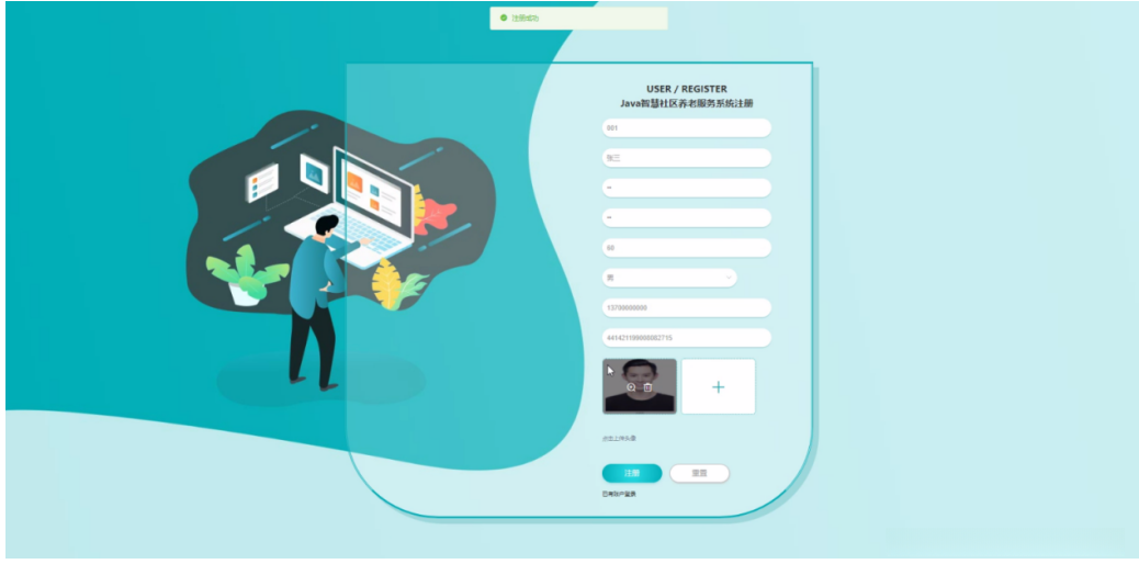 当老人进入前台系统进行相关操作前必须先注册登录,在注册页面填写老人账号、姓名、密码、确认密码、年龄、性别、手机、身份证、头像等信息,然后点击注册,如图5-2所示。