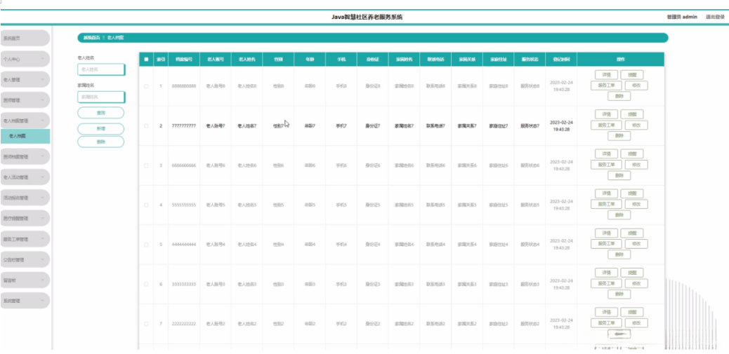 管理员点击老人档案管理,在老人档案管理页面的输入档案编号、老人账号、老人姓名、性别、年龄、手机、身份证、家属姓名、联系电话、家属关系、家庭住址、服务状态、登记时间等内容,进行查询、新增或者删除老人档案等操作,如图5-11所示。