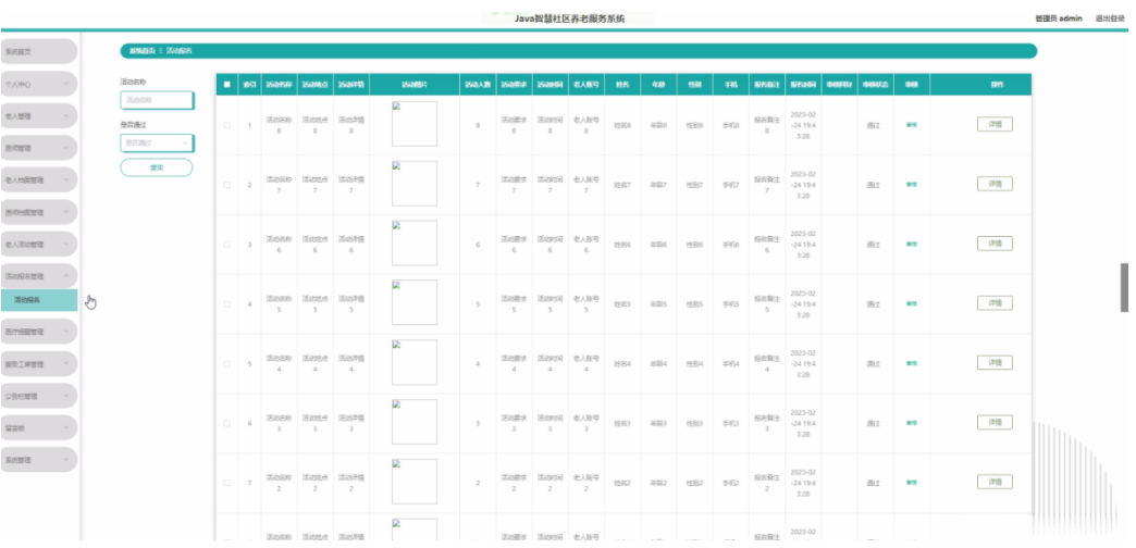 管理员点击活动报名管理,在活动报名管理页面的对活动名称、活动地点、活动详情、活动图片、活动人数、活动要求、活动时间、老人账号、姓名、年龄、性别、手机、报备备注、报备时间、审核回复、审核状态、审核等内容,进行查询或者删除活动报名等操作,如图5-14所示。